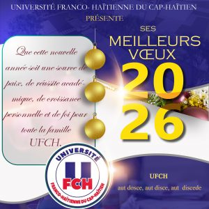 En ce début de nouvelle année, il m’est particulièrement agréable, en ma qualité de Recteur de l’Université Franco-Haïtienne du Cap-Haïtien (UFCH), d’adresser un message de vœux et de vision à l’ensemble de la communauté universitaire : enseignants, personnel administratif et technique, étudiantes et étudiants, partenaires institutionnels, ainsi qu’à tous les amis et sympathisants de notre université.